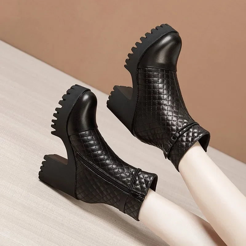 Elevate your style with our elegant ankle boots! Crafted with genuine leather, these block high heels add height and sophistication to any outfit. The warm plush interior keeps you cozy during fall and winter. Perfect for any occasion, these versatile black booties are a must-have for any woman's shoe collection.