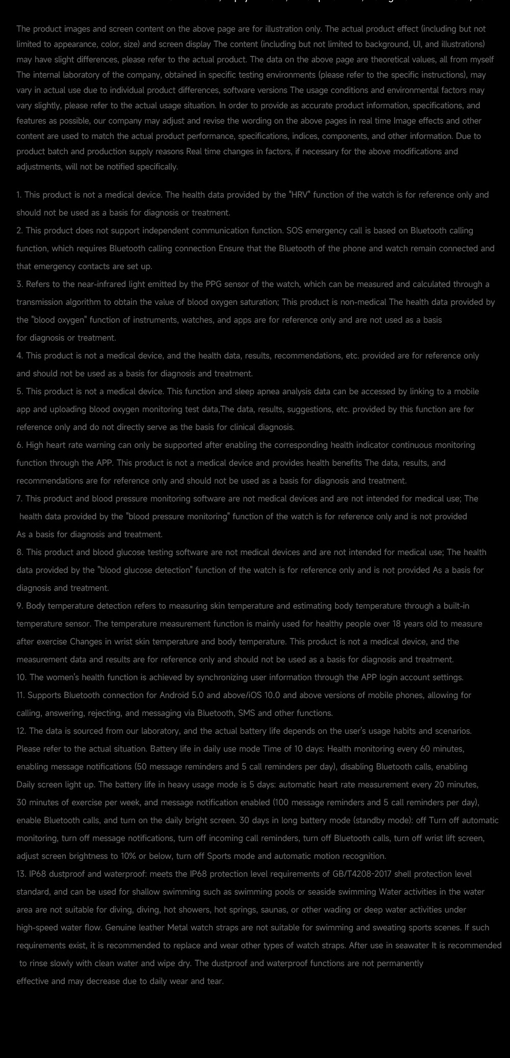 Health features: non-invasive blood glucose measurement, HRV detection, body temperature monitoring, Metz function, SOS emergency call function, heart rate monitoring, blood oxygen monitoring, blood pressure monitoring,