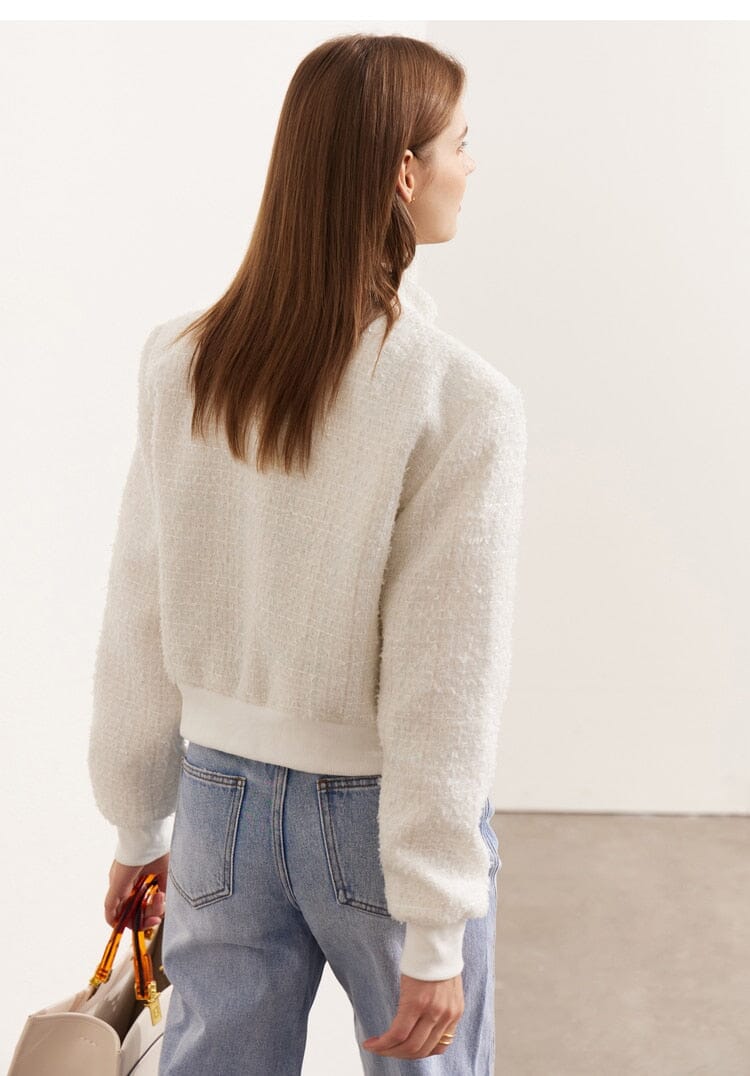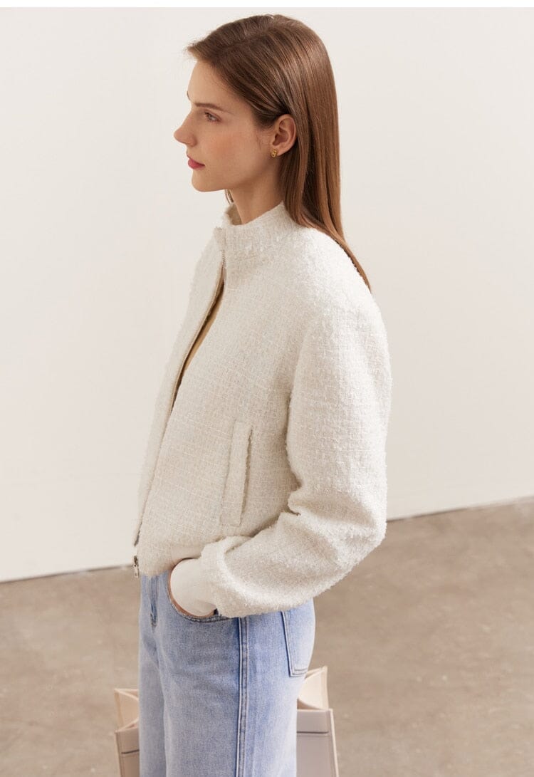 Jacket All-match Stand-neck Wide Shoulder Petite Tweed Design Zipper Jacket