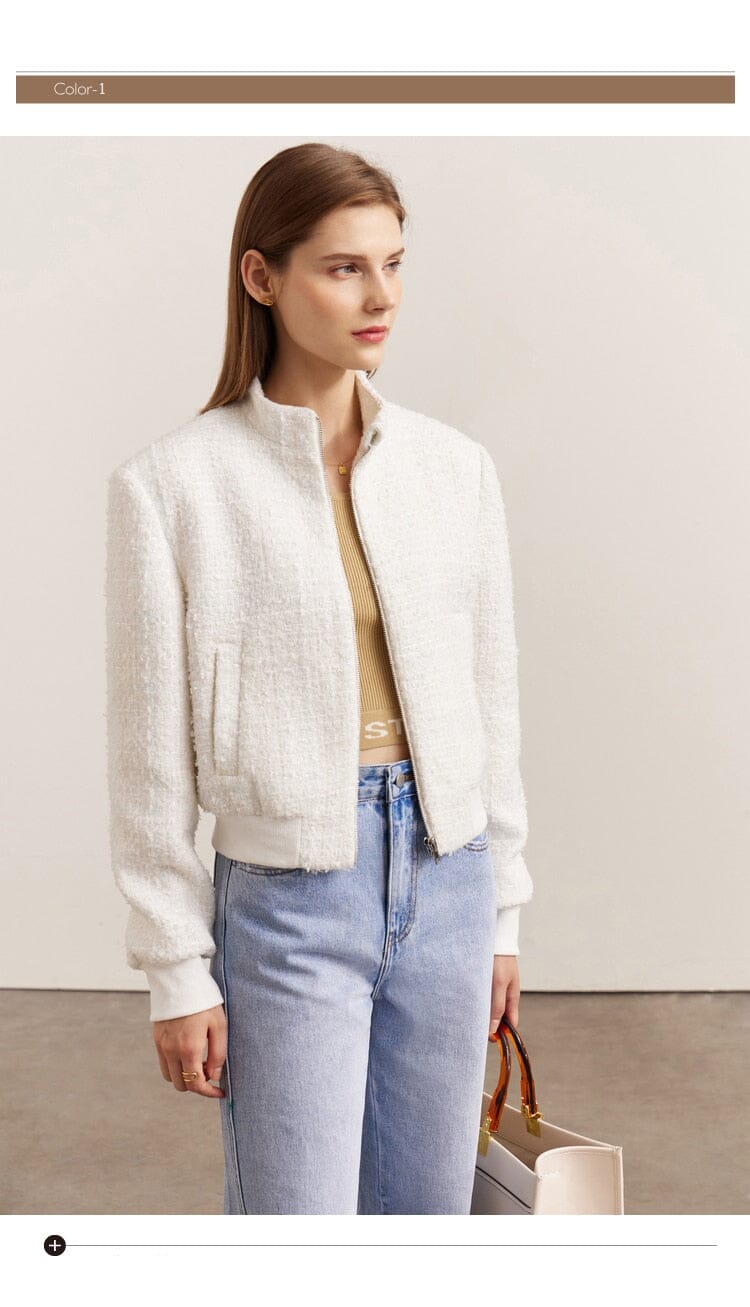 Stay warm and stylish with our Autumn Tweed Zipper Jacket. This petite jacket features a stand-neck design and a trendy zip closure. Perfect for the winter season, this jacket is made for women who want both fashion and function. Elevate your winter wardrobe with this must-have piece.