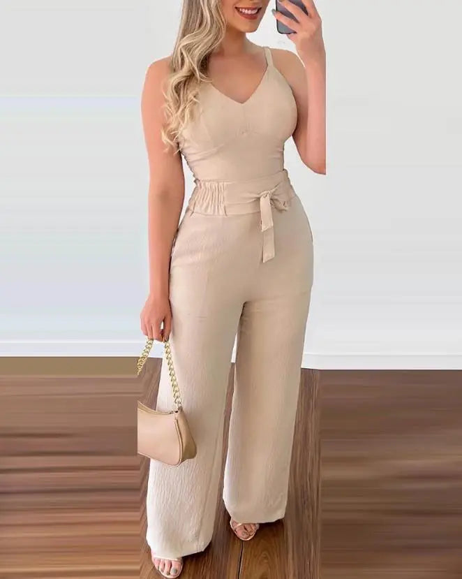 Upgrade your spring wardrobe with our Two Piece Sets Women Outfits. Featuring a shirred V-neck cami top and high waist pants with pockets, this set effortlessly combines style and functionality. Perfect for any occasion, from dressy to casual, our jumpsuit offers comfort and versatility. Don't miss out on this must-have fashion piece."